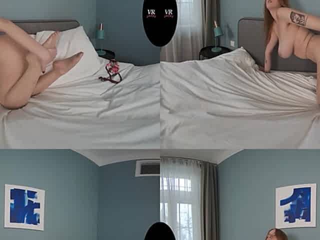 Pretty redhead shows off her amazing tits and caresses her fiery peach