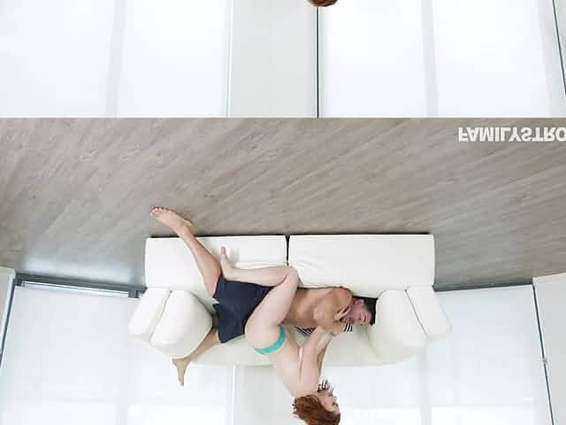 Cute curly redhead Anee Ocean is eager to pet her wet pussy on sofa