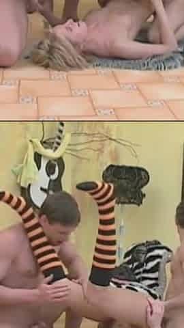 Beautiful Teen with Small Tits Ass Fucked and Cummed in Mouth by Two Monster Cocks