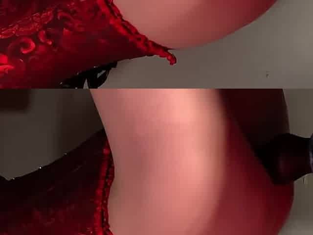Red-haired beauty rides a dildo in sexy lingerie.