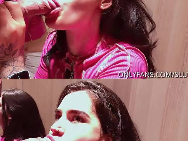 Brunette chick hides from MILF to suck stepdad's fat hammer