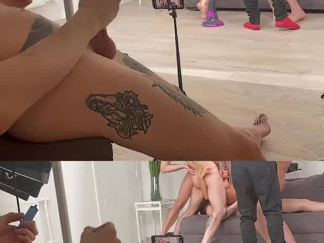 Cuckold watches and masturbates as his girlfriend gets fucked hard in the ass by big dicks