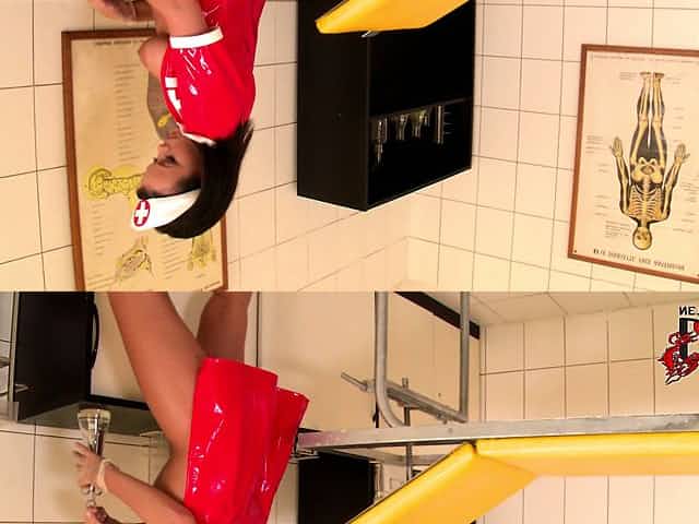Super lusty nurse in red latex suit puts on rubber gloves and fills her ass with phallic stuff