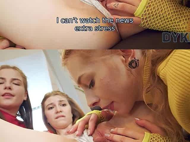 DYKE4K. Three sexy girls taste each other pussies and enjoy hot lesbian kisses