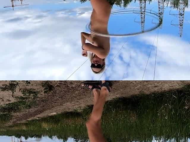 Exhibitionist girl spins hoop in Russian field