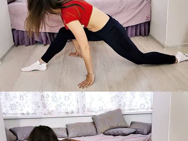 Sexy babe enjoys stretching her pussy while doing acrobatic moves