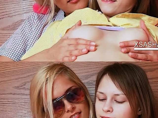 Playful teen lesbo Sasha sucking her girlfriends boobies