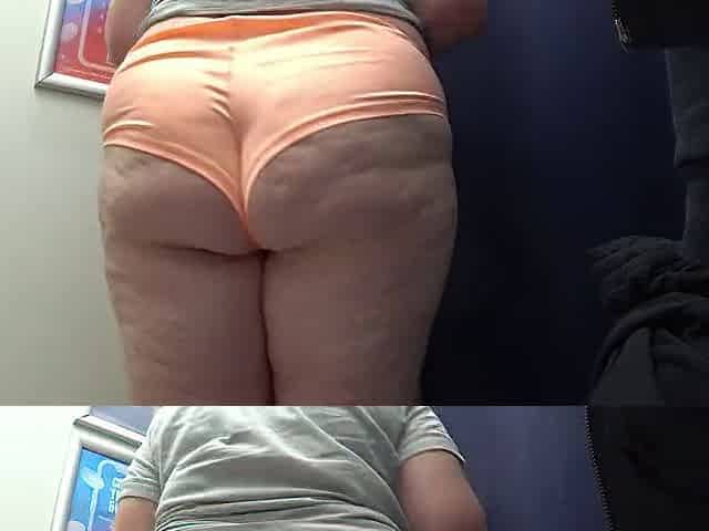 The camera in the fitting room watches a mature big ass in satin panties. Curvy milf changes clothes. PAWG