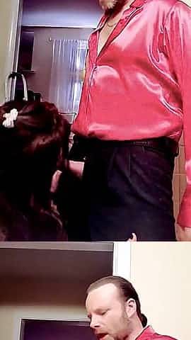 Sarah is wearing no thing but red, satin gloves whilst giving a blow job to her married lover