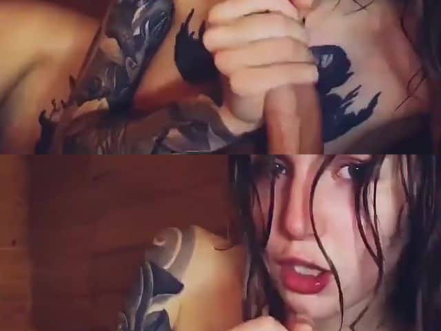 Oral creampie for tattooed blowjob queen in sauna