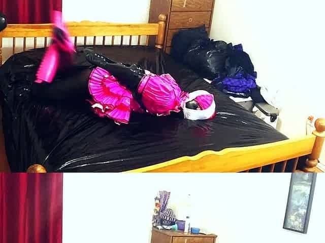rubber chastity pig in self bondage frustrated trying to get free oink