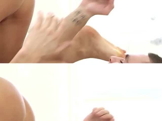 Cherry Kiss gives sensual oily footjob after relaxing pussy rubdown.