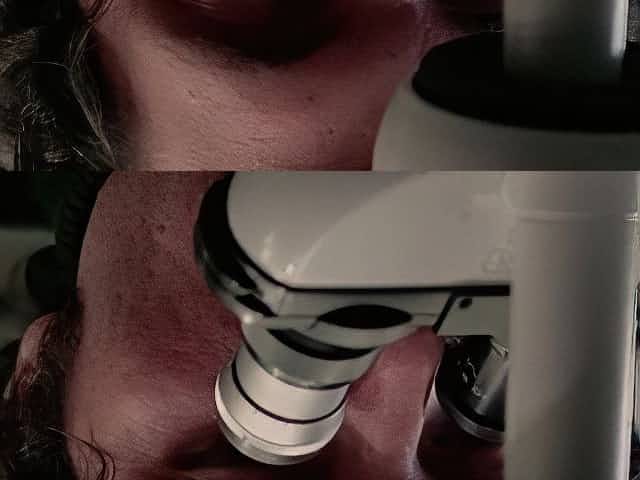 Blonde lies down on table to open three holes for the nerd