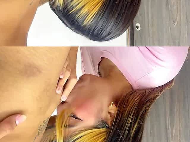 Brunette hottie blowing stiff dick of a inked younger guy who hard as fuck ready to blow his load