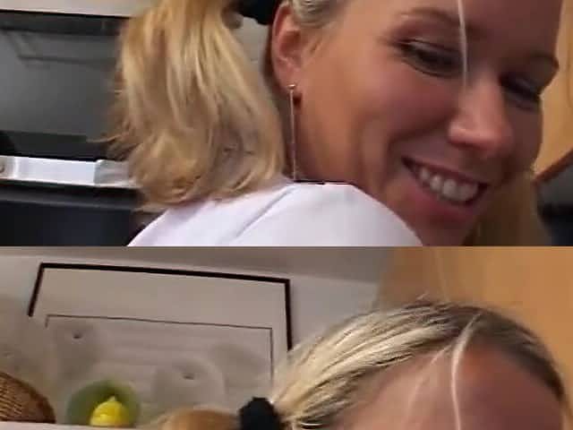 Pigtailed, German golden-haired hotty is having casual sex with her step- father, in the kitchen