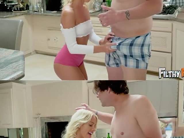 Pigtailed, German golden-haired beauty is having casual sex with her step- father, in the kitchen