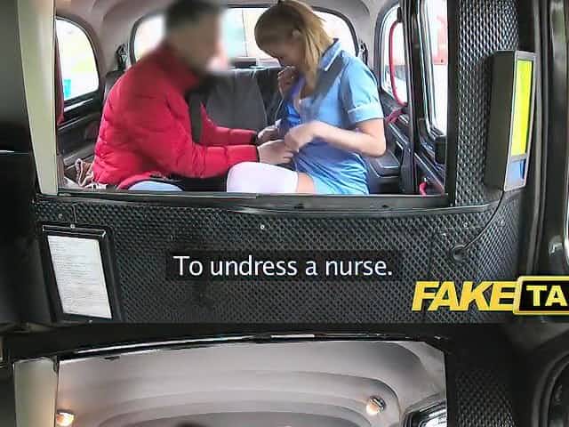 Busty nurse in uniform bangs in fake taxi