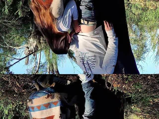 Walking tour in the woods with double cumshot in the mouth