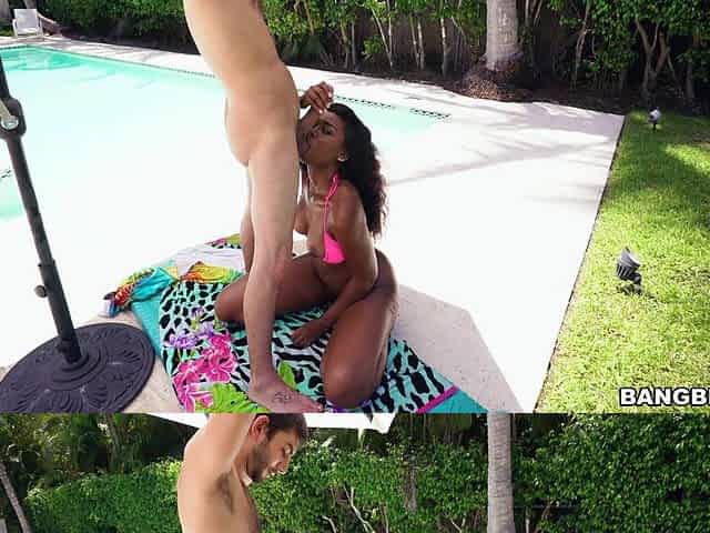 Ebony chick Misty Stone teases by the pool and gets fucked
