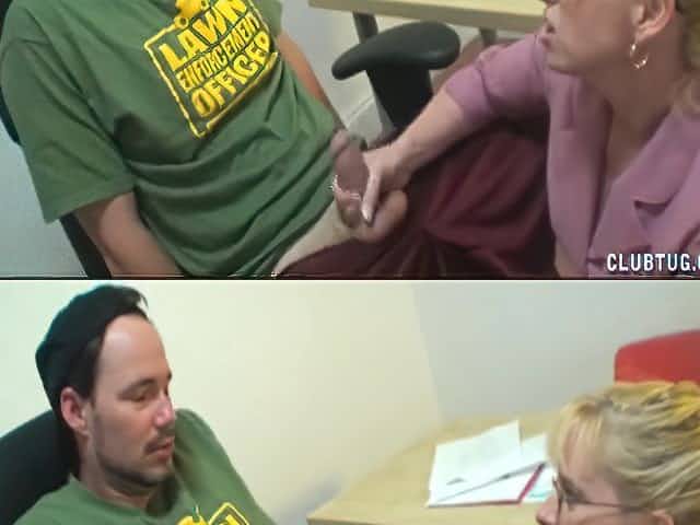 Horny dude jerks off while at work and his mature boss makes him cum