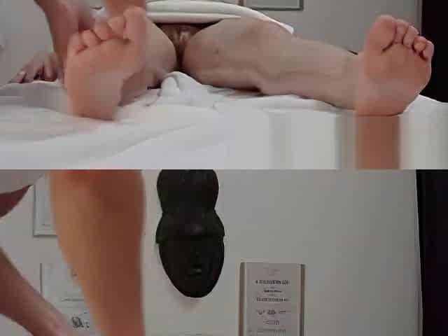 Brunette Takes Cumshot On Her Feet On Massage Table