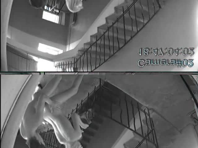 Naked blonde and guy fuck at the stairs in cool voyeur video