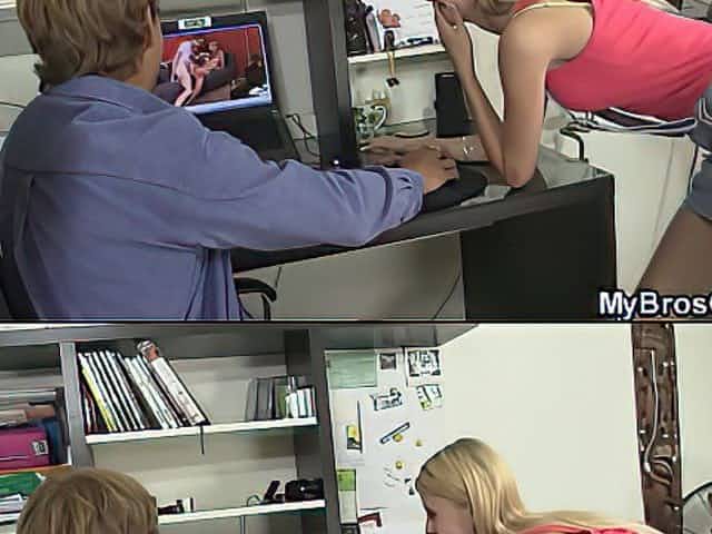 Slim blond with tiny titties is sucking her step- brother's jock and getting banged from behind