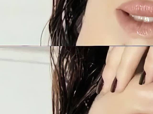Lusty brunette provokes with her sexy body and hot lips