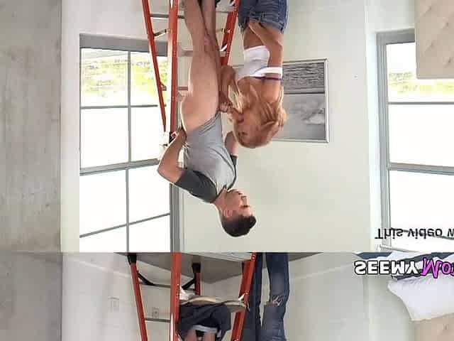 Youthful hotty pulls red pants aside and has sex on the stairs