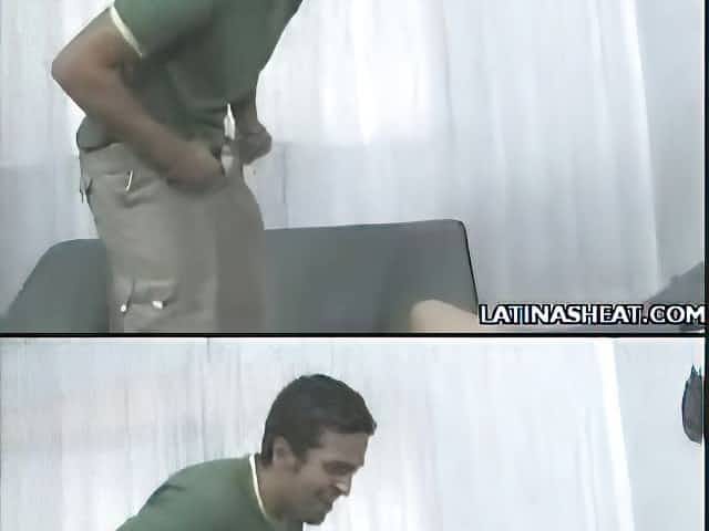 Sexy little Latina blows one dude and is drilled by the other in a threesome