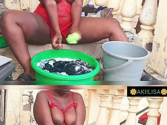 Afro sweetheart doing laundry in a crotchless red underware