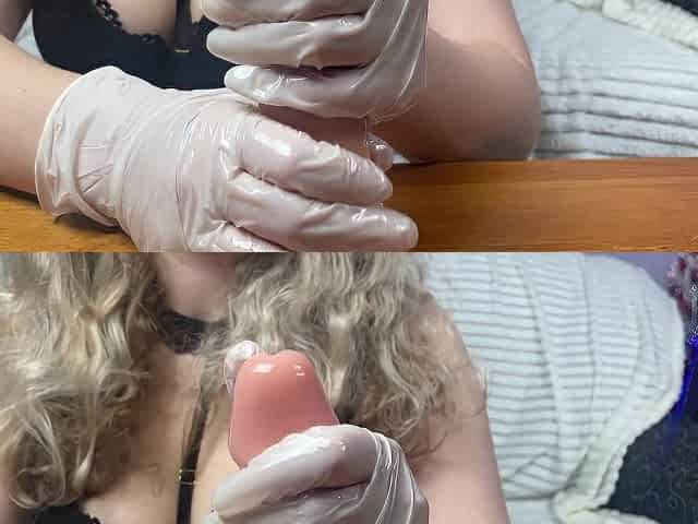 hot guy dances and massages his big hard cock with lube in gloves and jerks off hard