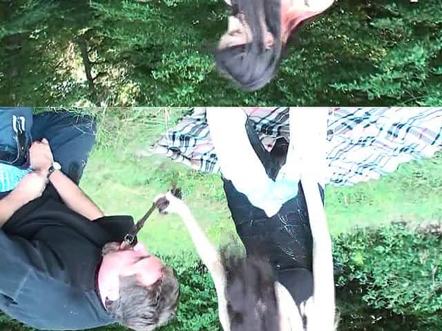 Babe walking male stick on a stick in public