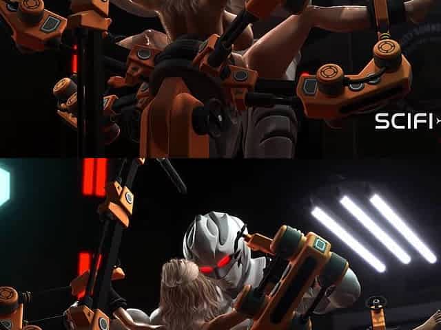 Busty sexy blonde and extreme sex with an android in the sci-fi lab