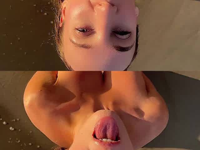 Gal kneels with tongue hanging out willing for your filthy finish on her face and bazookas