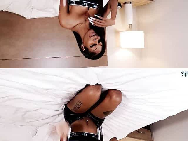 Ebony T-girl with sexy lips masturbates really big cock