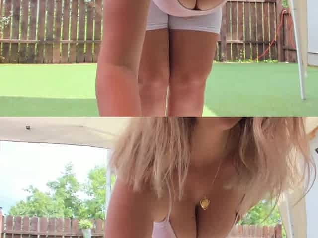 My neighbor is shaking her huge boobs on the yard