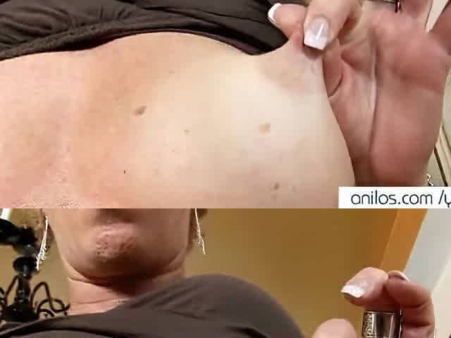 Big-boobed chubby granny Rina M nicely plays with her shaved pussy