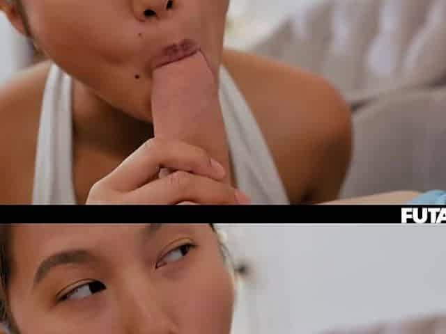 Oriental T-girl knows how to handle a big cock in her mouth and she's so slutty