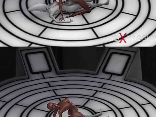 Provocative sci-fi female alien plays with a black girl in the space station 3D cartoon