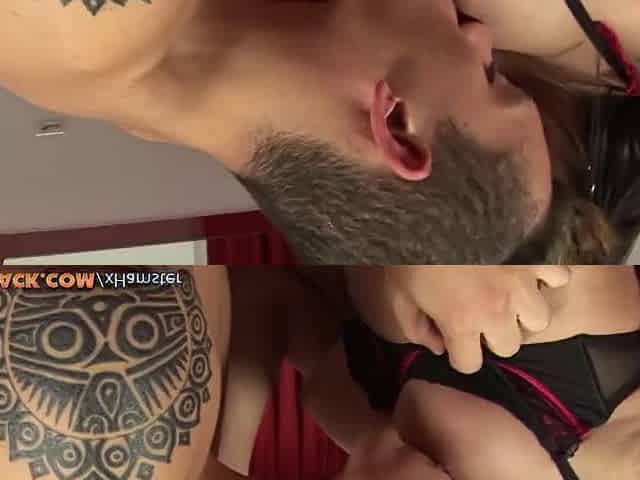Beautiful shemale in black lingerie gets fucked bareback by