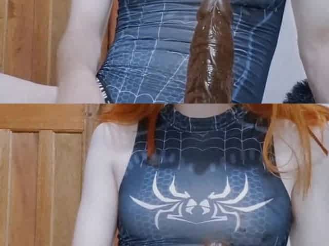 Brunette hair ladyboy in ebony costume jerks off her shaggy wang untill obscene spunk fountain