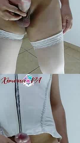 Cute trans hotty undresses without work clothing and cums during livecam show