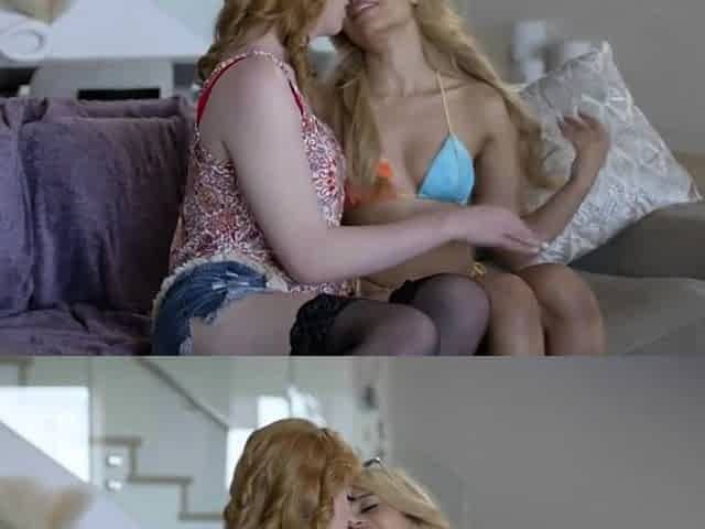 Blonde tranny in black stockings fucks a brunette girl in