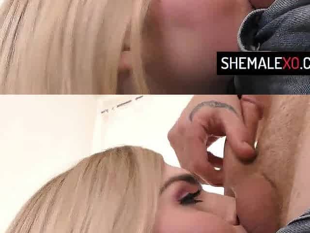 Gorgeous blond t-girl giving the butt and sitting on the shlong.