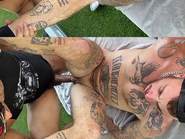 Inked tgirl barebacks in interracial duo after frottage