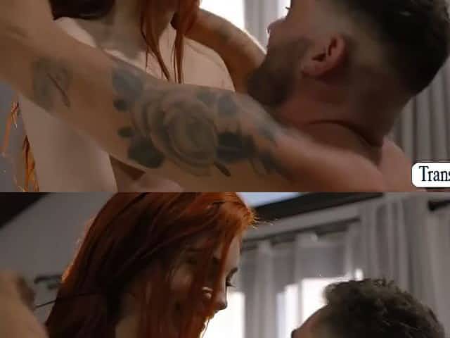 Busty redhead tranny fucks bareback after blowjob with tattooed boyfriend