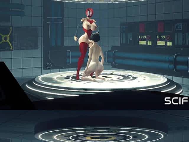 I just want your dick! Female robot shemale fucks a sexy cuffed busty brunette in the sci-fi lab