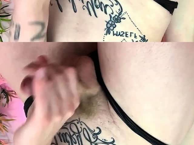 Tranny in lingerie gives herself a hot cumshot