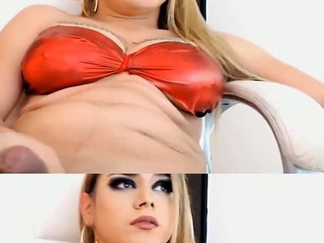 Blond haired phat tranny Tayana de Castro sucks BBC before getting her anus fingered tough